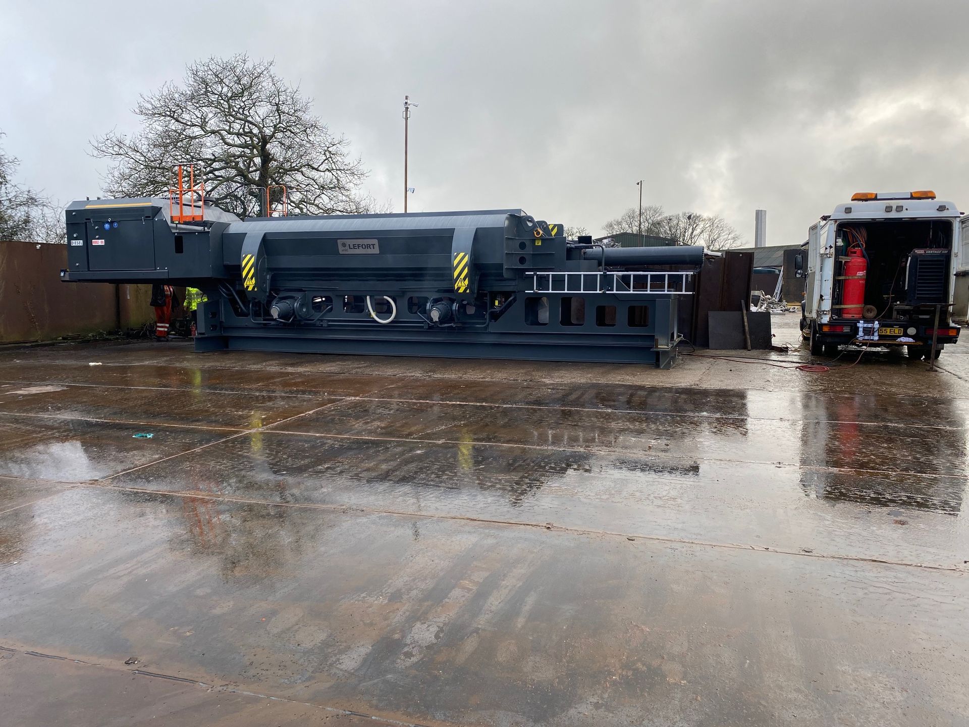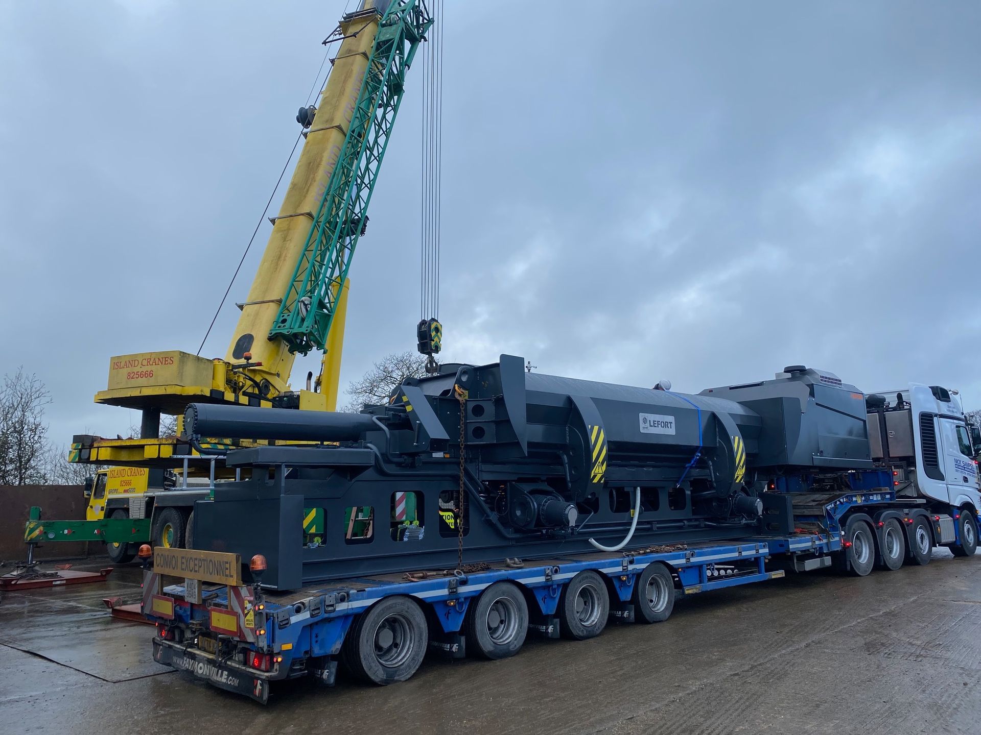 With a gross machine weight of 74 tonne, it was too heavy to bring to the Island on any of the ferry routes. Instead it was transported by road from Belgium to Southampton, where it was craned onto a barge and floated across the Solent to East Cowes where it was craned off and then transported by lorry to our site at Cowes. Thanks go out to Island Crane Services and Williams Shipping for their assistance.